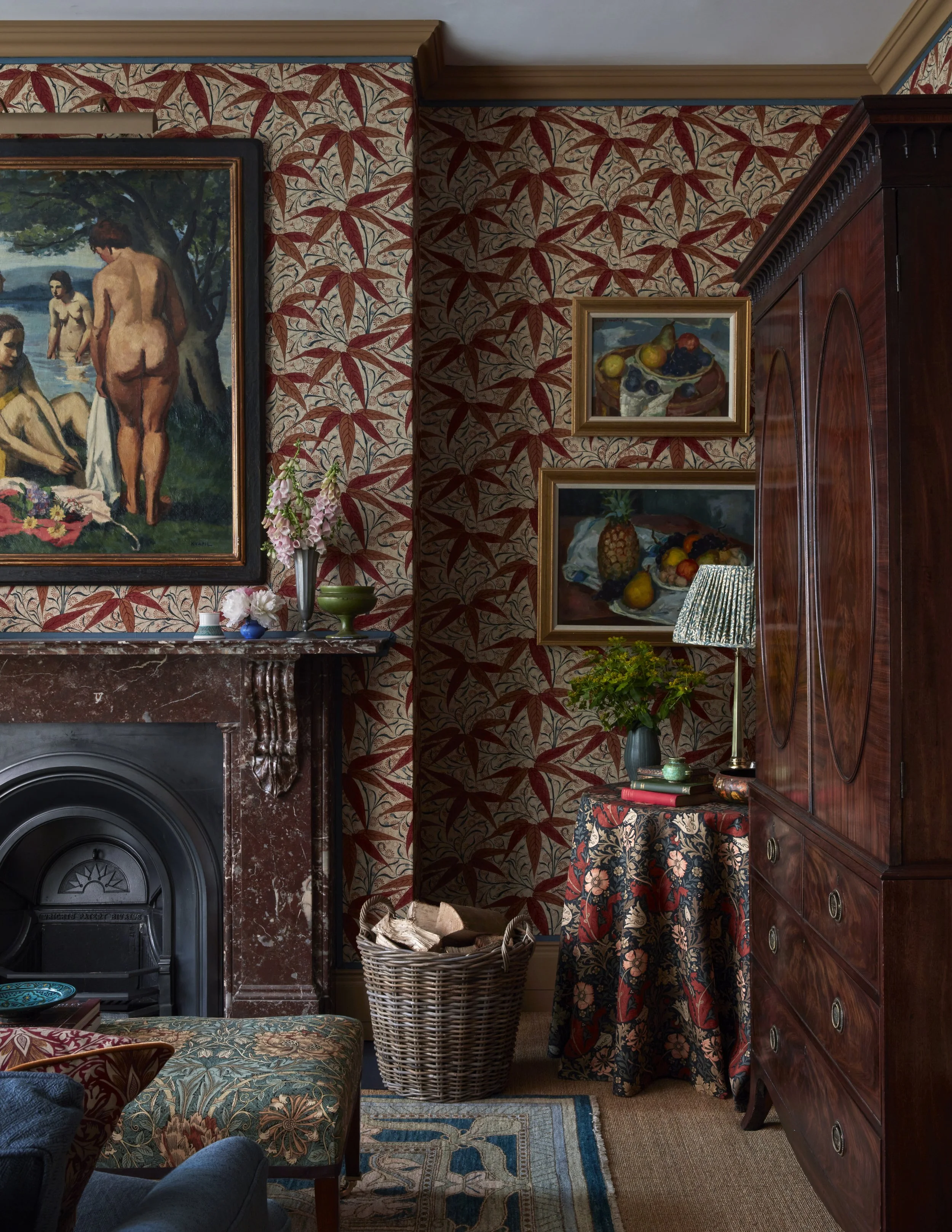 I puzzled over the challenge for a bit, but the breakthrough moment was when I found a Morris & Co fabric called “Bamboo”, which was based on a design by E.W. Godwin. Although it was on linen, I knew it was originally a wallpaper design because I’d happened to see it before (it’s in the V&A collection). So when I asked if we could paper-back the fabric, and Sanderson agreed, everything else came together quickly.