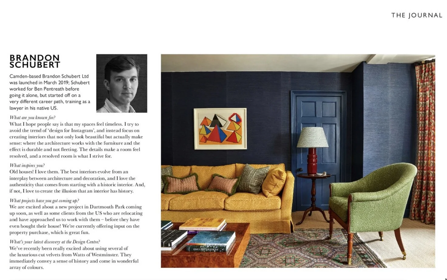Selected Press House & Garden: Brandon Schubert cleverly mixes periods and styles in a Victorian villa in north London January 2025 House & Garden: Brandon Schubert tells the story of a 16th-century cottage in one of Wiltshire's loveliest villages August 2024 House & Garden: An Arts & Crafts house brought back to life by Brandon Schubert February 2022 House & Garden: Brandon Schubert named to House & Garden’s list of the Top 100 Interior Designers & Architects November 2021 House & Garden: Brandon Schubert wins the Rising Star Award 2021 October 2021 House & Garden: Brandon’s Dos and Don’ts of Decorating October 2021 House & Garden: The new entries to our Top 100 whose work you need to know September 2021 The Journal, Design Centre Chelsea Harbour: Ones to Watch August 2021 Coveteur: Meet the Next Generation of Interior Designers January 2021 Farrow & Ball: How Our Favourite Designers Use Farrow & Ball January 2021 House & Garden Feature: Brandon Schubert’s sophisticated London flat November 2019